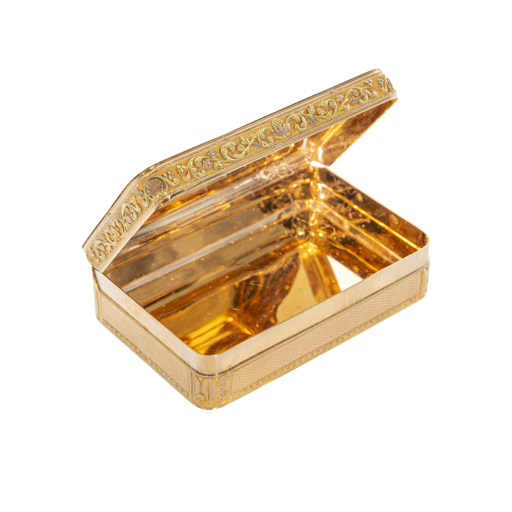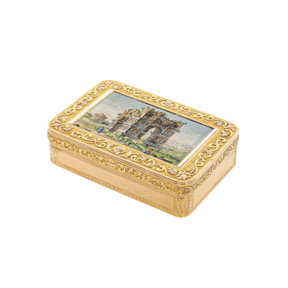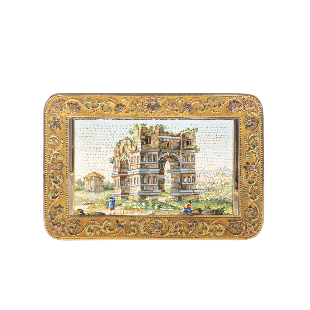 A gold snuffbox with micromosaic representing the Arch of Janus and the temple of Cybele.