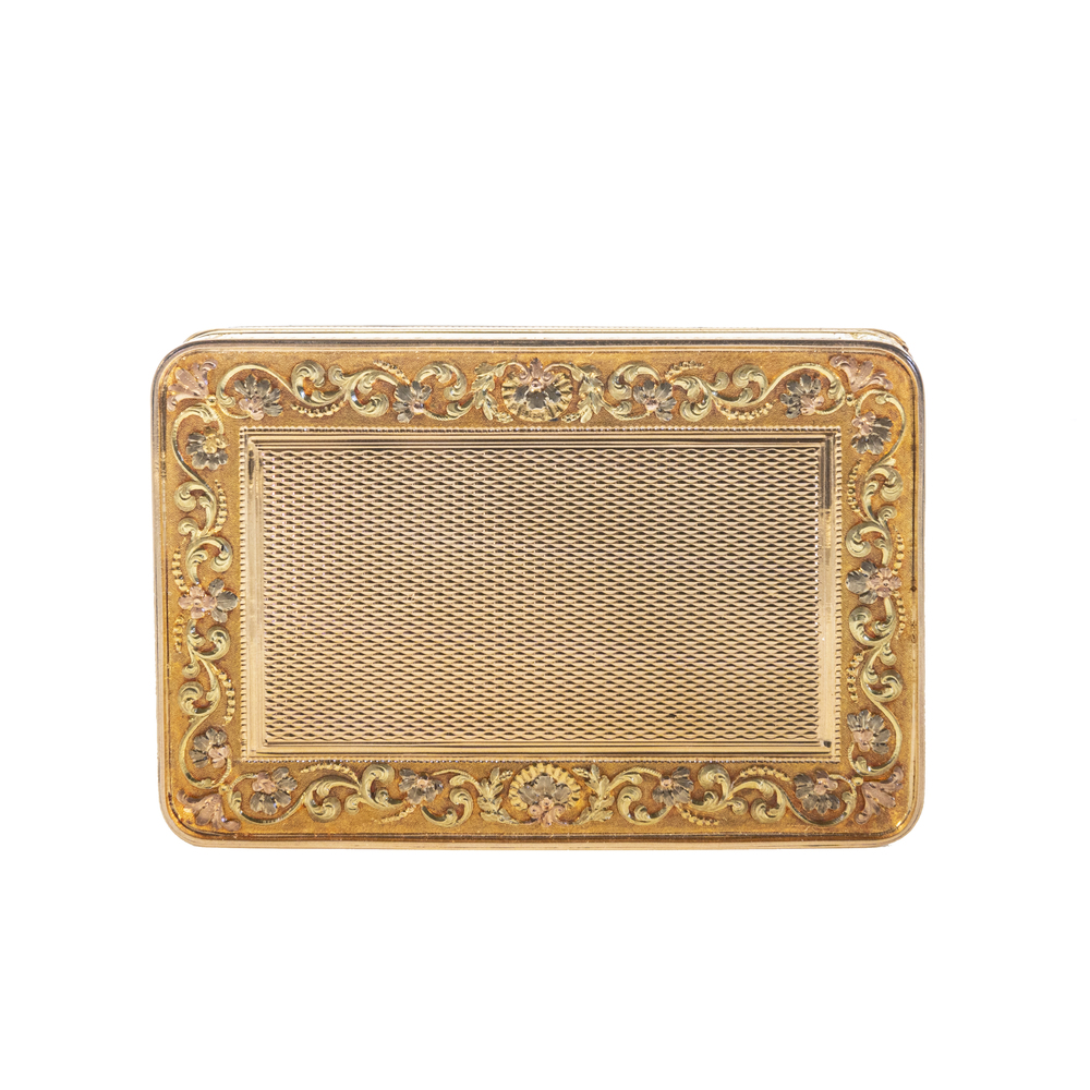 Tabacchiera in oro con micromosaico raffigurante Arco di Giano e tempio di Cibele.