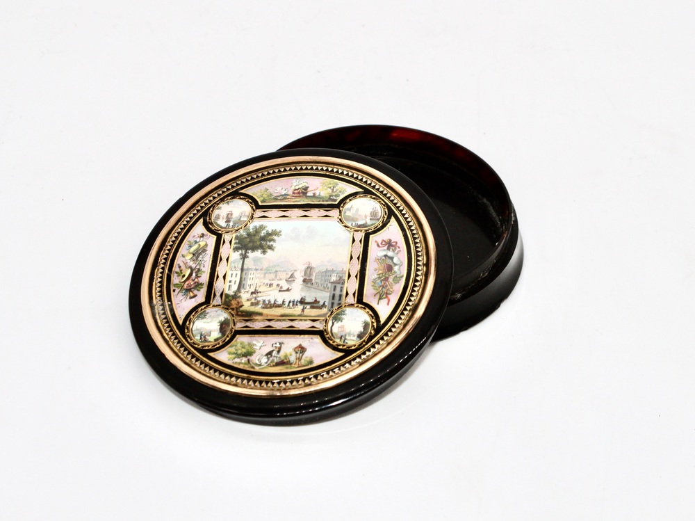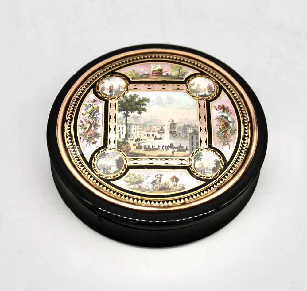 Lid with a refined painting on mother-of-pearl depicting a port scene.