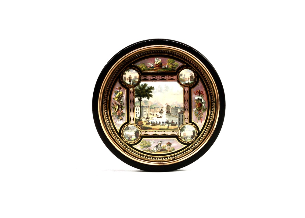Coperchio con raffinato dipinto su madreperla raffigurante scena portuale.