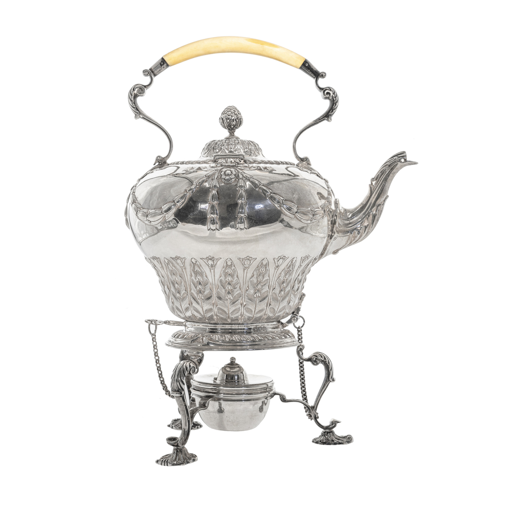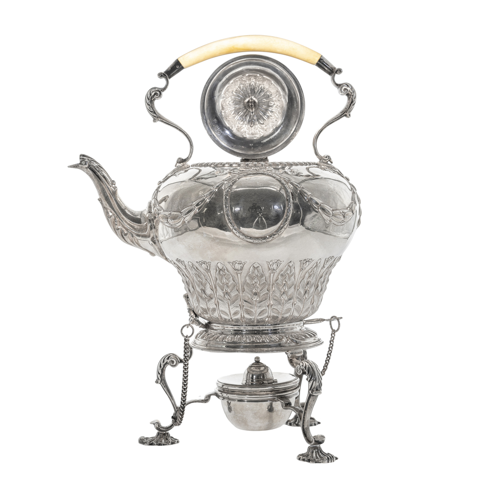 A silver samovar with ivory grip