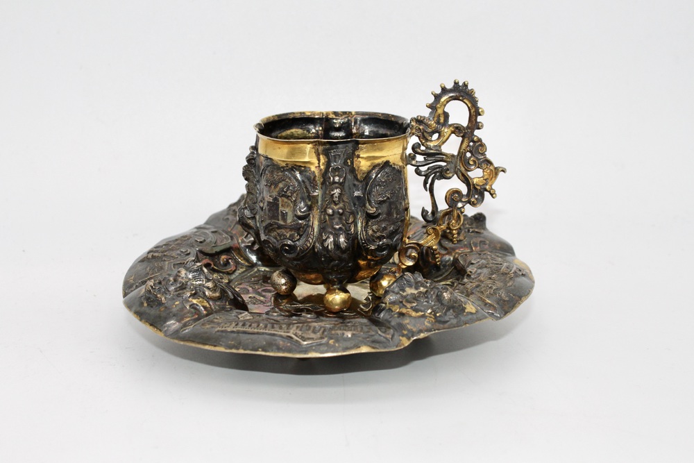 Tazza con piattino in argento dorato finemente lavorato