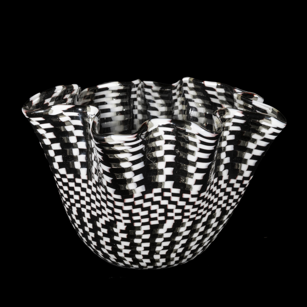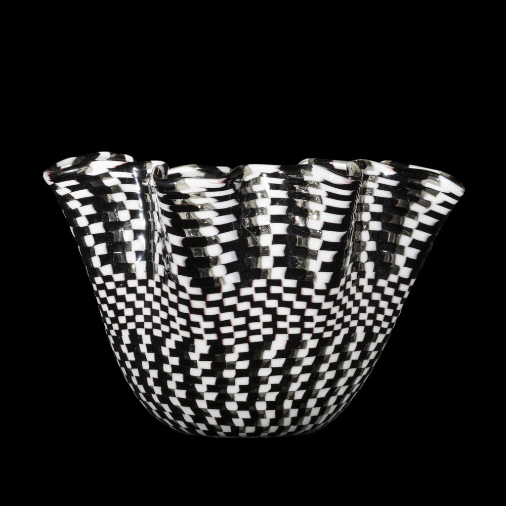 Vaso a forma di fazzoletto realizzato con tessere in vetro bianco ,nero e cristallo a formare un intreccio.