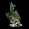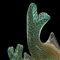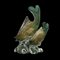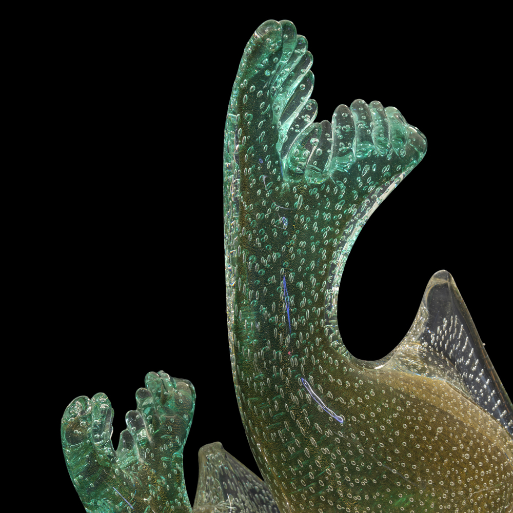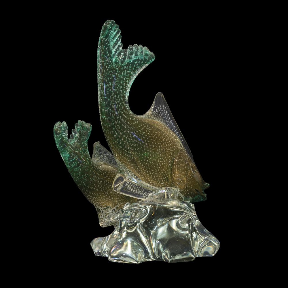 Scultura raffigurante una coppia di pesci in vetro sommerso verde smeraldo con inclusioni di polvere e foglia d'oro su base in vetro cristallo.