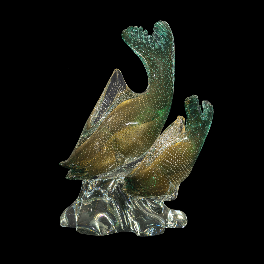 A sculpture representing a pair of fish in emerald green submerged glass with inclusions of dust and gold leaf on a crystal glass base