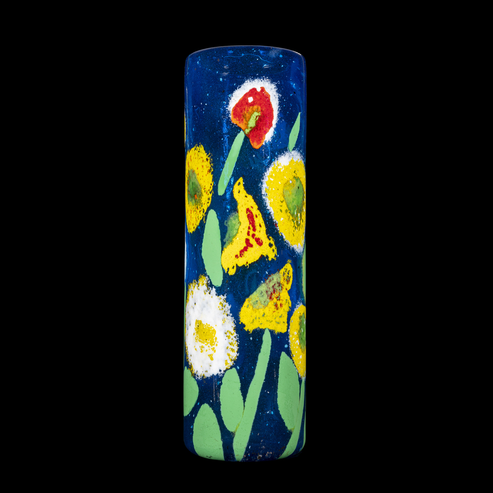 Prototype of cylindrical vase in aquamarine glass with hot application of glass powder