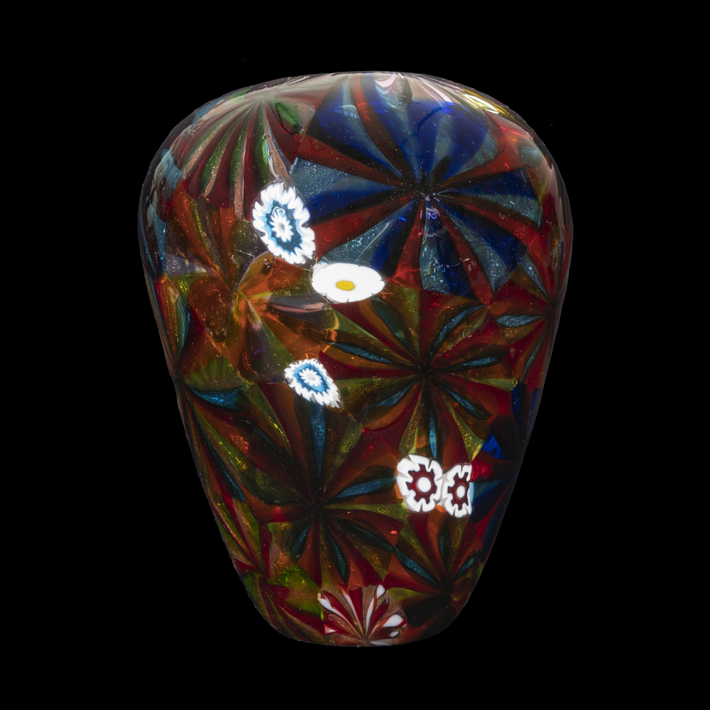 A cylindrical vase obtained from the fusion of large star-shaped murrine made with fused canes of unusual color and aventurine.