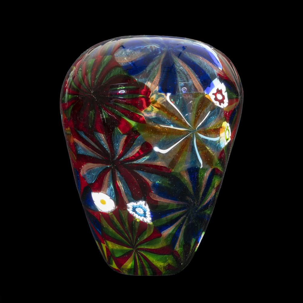 Vaso a forma cilindrica ottenuto dalla fusione di grandi murrine a stella realizzate con canne fuse di insolita colorazione ed avventurina .