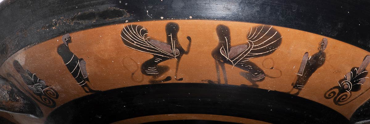 Very nice kylix, with shining surface. On both external sides, two seated sphinxs, affronting each others, with spreaded out wings on the back and tail rolled as a "s"; on their side, two draped figures. Under the handles, palmettes shoots. Double circles in the inner tondo. Intact. Provenance: Property of an English fashion and textile designer, said to been given to her as gift in the 1980s.