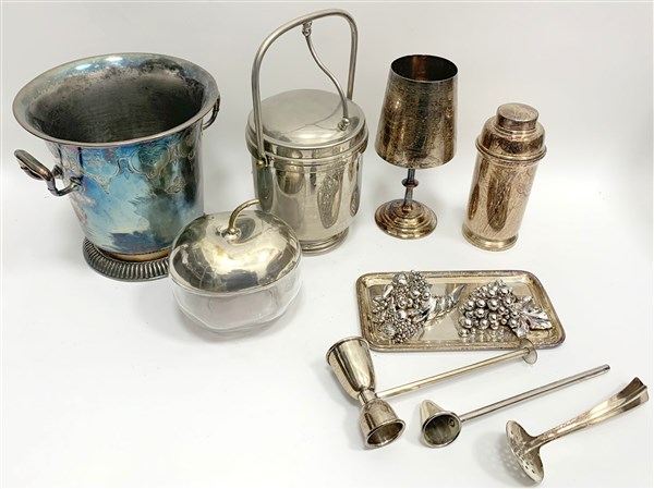 Lotto in metallo composto da due secchielli portaghiaccio, un calice, uno shaker, un porta zucchero in forma di mela e sei oggetti vari (difetti)