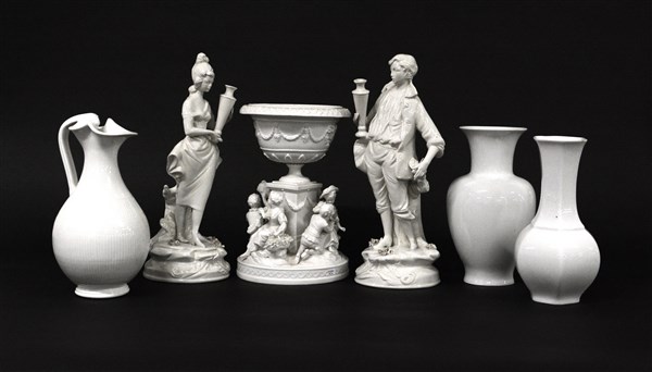 Manifature diverse, lotto composto da una brocca, due figure, due vasi ed un centrotavola in porcellana, ceramica e bisquit (h max cm 39) (difetti e mancanze)