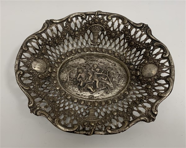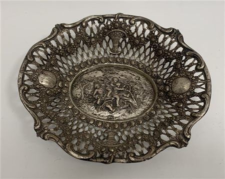 Cestino in argento traforato decorato a ghirlande di fiori e putti giocosi nel cavetto. Titolo 800 (cm 22,3x20) (g 200)