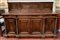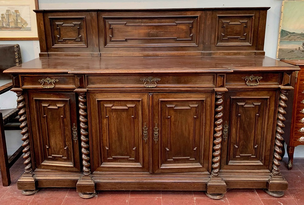 Credenza a tre cassetti e quattro ante riquadrate, montanti a torciglione, alzatina tripartita da pannelli riquadrati, piedi a sfera schiacciata, fine del secolo XIX (cm 210x145x63) (difetti)