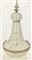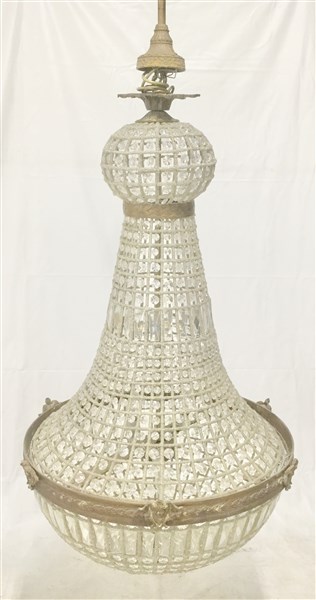 Lampadario a cesto con struttura in metallo decorata in rilievo a mascheroni, motivi vegetali con perlinature, rosette e prismi in vetro (h cm 120)(difetti)