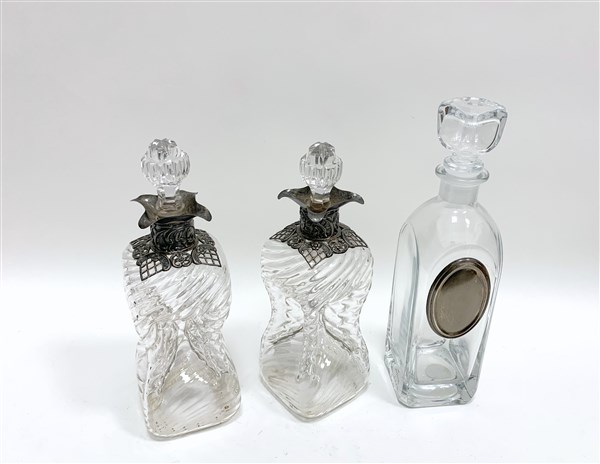 Lotto composto da una coppia di bottiglie in vetro con tappi, corpo costolato e ghiere in argento, e una bottiglia in vetro con tappo centrata da placca in argento (difetti)