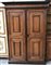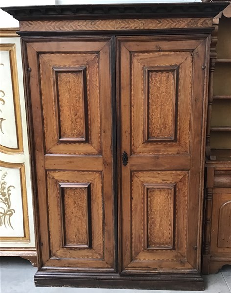 Antico armadio a due battenti con specchiature intarsiate a volute e motivi geo