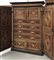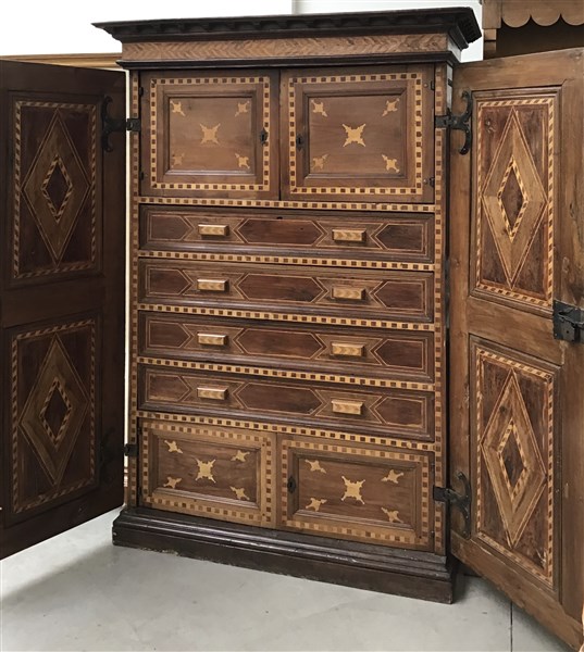 Antico armadio a due battenti con specchiature intarsiate a volute e motivi geometrici. Internamente composto da quattro cassetti e vani con sportelli e segreti (cm 141x200x71) (difetti e restauri)