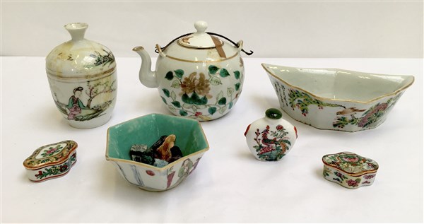 Lotto composto da una teiera, due ciotole, due scatoline con coperchio, un vasetto e una snuff bottle in porcellana. Cina, sec.XX