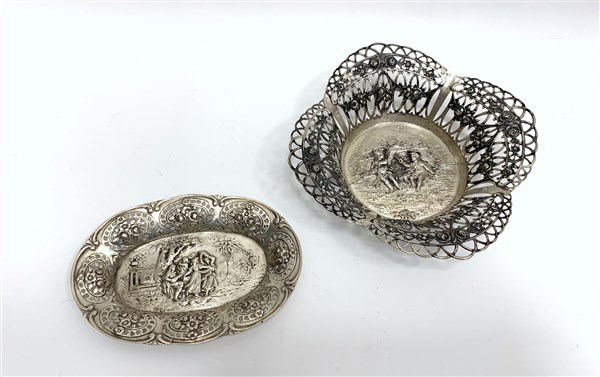 Lotto composto da un cestino ed un vassoietto in argento con bordi traforati e cesellati a fiori, decorati in rilievo nel cavetto con scena di festa all'aperto e putti (g 220) (difetti)