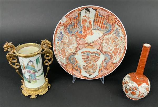 Lotto composto da un vasetto a bottiglia, un piatto a decoro policromo e un portapennelli montato in metallo dorato. Manifatture diverse
