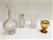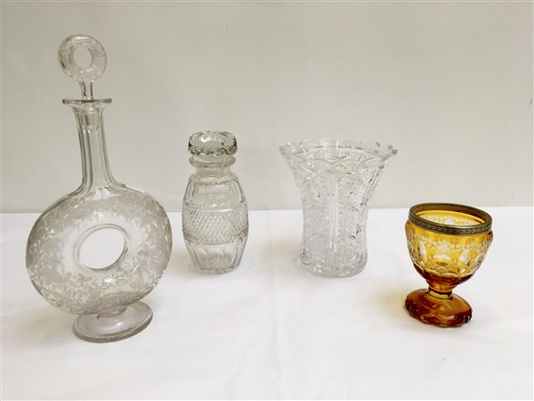 Lotto composto da un bicchiere in vetro manifattura di Boemia con ghiera in argento, due bottiglie con tappo e un vaso in vetro (difetti)
