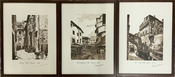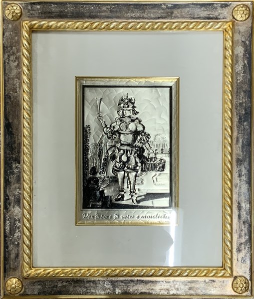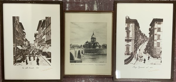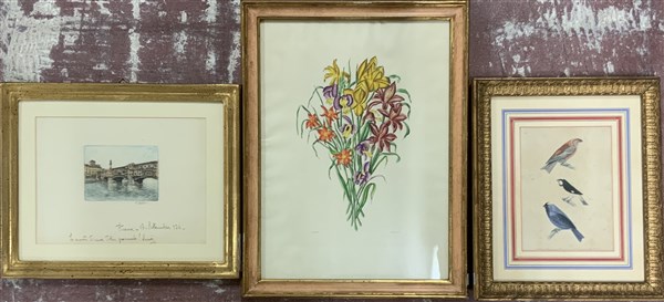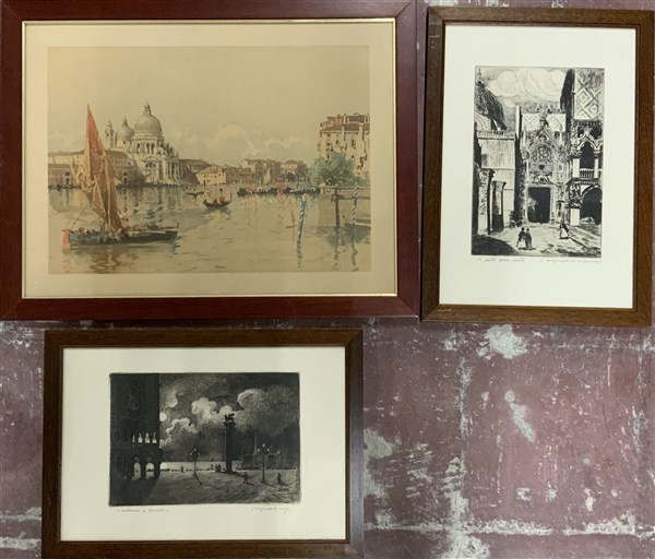 Lotto composta da tre acqueforti, due litografie a colori, un multiplo su lamina d'argento e otto riproduzioni di autori, soggetti e misure diverse, in cornici (difetti)