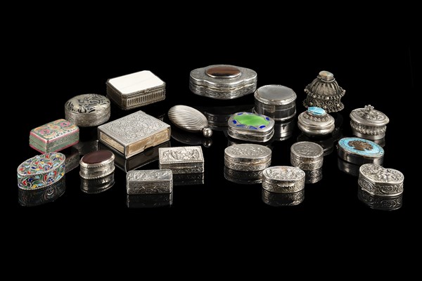 Lotto composto da venti scatoline in argento, metallo argentato, smalti e altri