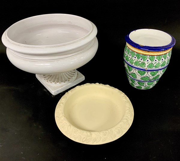 Lotto composto da due vasi ed una ciotola in ceramica e terracotta di manifatture e decori diversi (difetti)