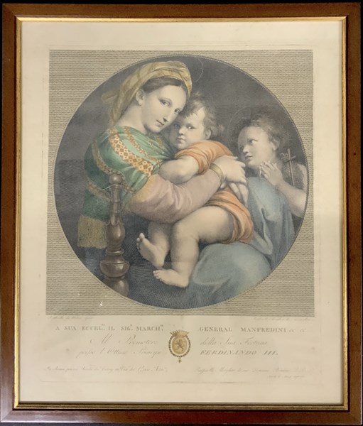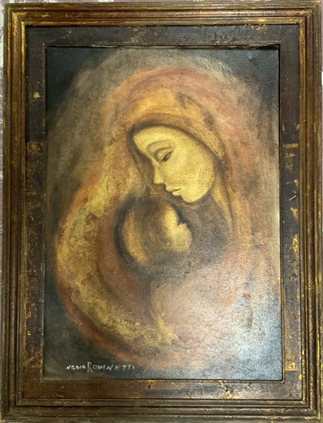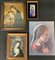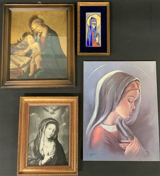 Lotto composto da un dipinto ad olio, un'incisione a colori, una placca in lamina d'argento e tre riproduzioni raffiguranti la Madonna (cinque in cornici) (difetti)