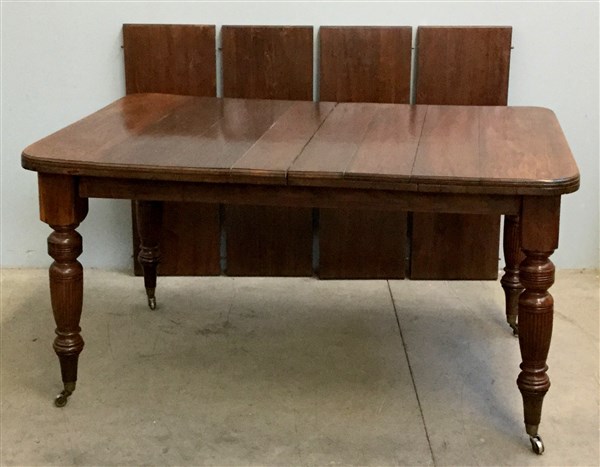 Tavolo in mogano allungabile gambe tornite munite di rotelle, quattro prolunghe. Secolo XIX (cm 153x82x103)(difetti)