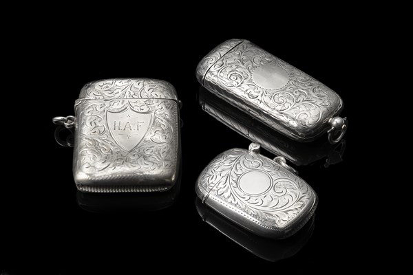 Lotto composto da tre porta fiammiferi in argento inciso. Punzoni inglesi (g 84) (difetti)