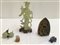Lotto composto da una scultura in pietra dura verde raffigurante dama reggente vassoio, base in legno unita ad un coniglietto in lapislazzulo, una scimmia in agata, un buddha in pietra dura e due frutti in pietra dura verde montati in metallo argentato.