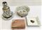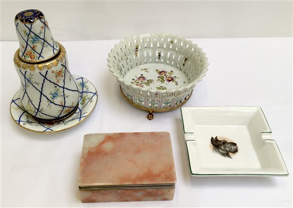 Lotto composto da una bottiglia da notte in porcellana di manifattura francese, un cestino in porcellana traforata, un posacenere ed una scatola in quarzo rosa (rotture)
