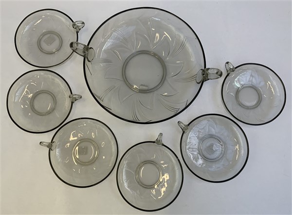 Servizio da frutta in vetro fumè, composto da: sei coppette e un piatto da portata (difetti)
