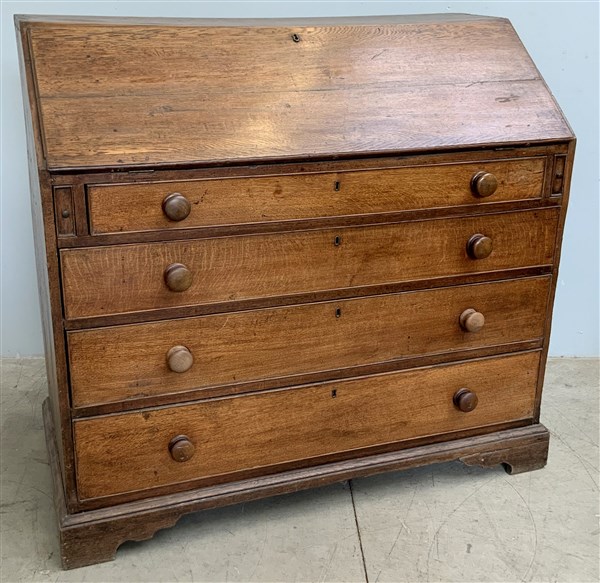 Ribalta in rovere a tre cassetti e mezzo, anta ribaltabile celante cassettini e vani. Inghilterra sec. XVIII (cm 136x119x60)(difetti e restauri)
