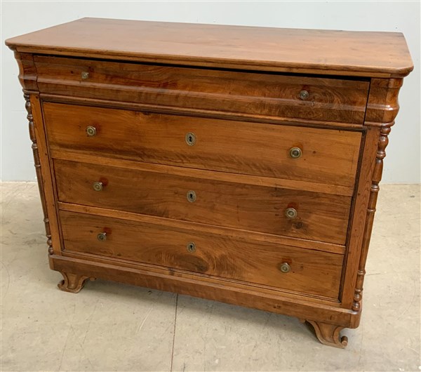 Cassettone a tre cassetti grandi e uno piccolo sottopiano con fronte ribaltabile celante cassettini. Montanti a mezza colonna, piedi sagomati. Secolo XIX (cm 127x101x59) (difetti)