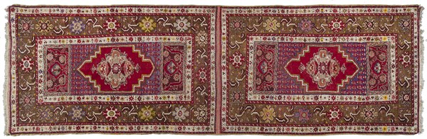 Probabile tappeto confezionato per le nozze composta da due tappeti gemelli uniti nel senso della lunghezza da un kilim color rosa. Decorazione a doppia nicchia con medaglione floreale su fondo rosso sovrastato alle due cuspidi da due cartigli con all'interno il motivo nuvole Chi-Chi rosso su fondo bordeaux. Angolari a fondo lavanda decorati con file di Boteh rossi. Bordura a gigli e rose su fondo tabacco. (cm 318x102) (lievi difetti)
