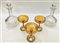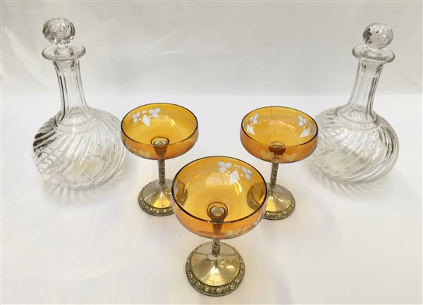 Lotto composto da due bottiglie con tappo in vetro e tre bicchieri a calice in cristallo molato e ambrato con basi in argento sbalzato (lievi difetti)