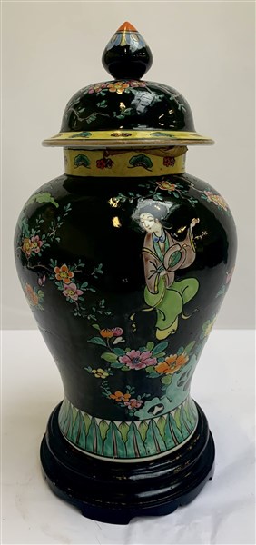 Potiche con coperchio in porcellana famiglia Nera, a decoro floreale con figure, base in legno