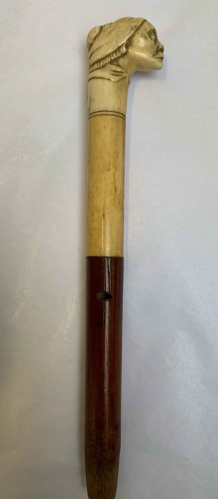 Manico intagliato a testa d'uomo in avorio e legno, secolo XIX (cm 25) (lievi difetti)