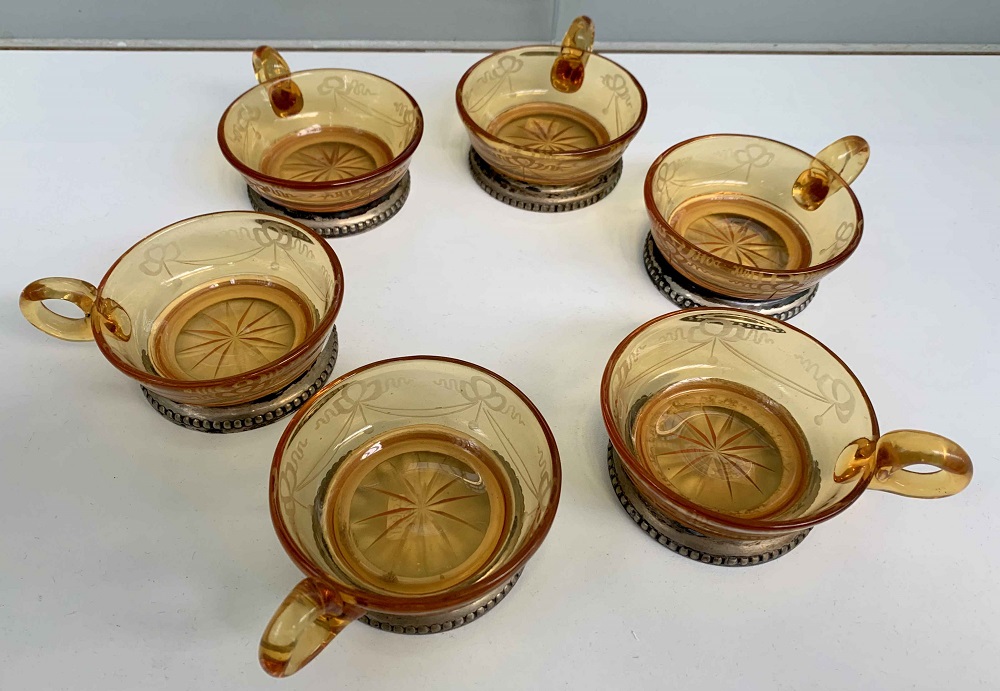 Lotto 249 | Gruppo di sei tazze in vetro molato e ambrato con basi in argento a profilo per