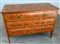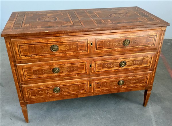 Cassettone a tre cassetti lastronato e intarsiato in legni vari gambe rastremat