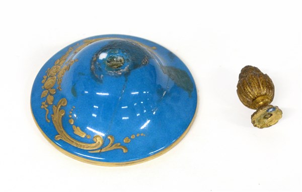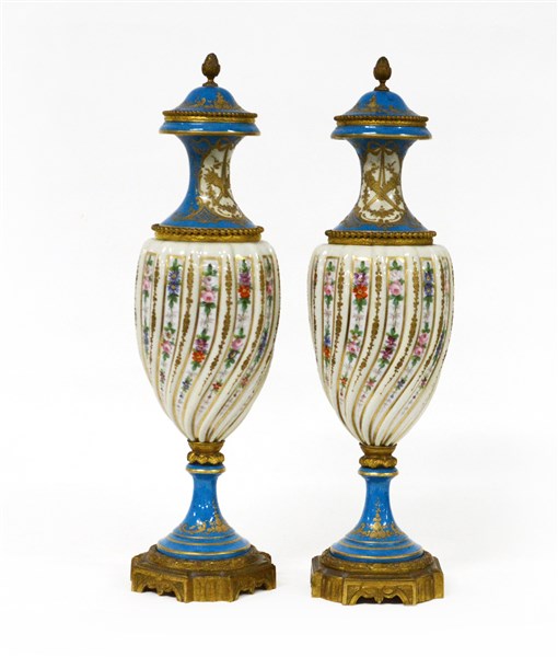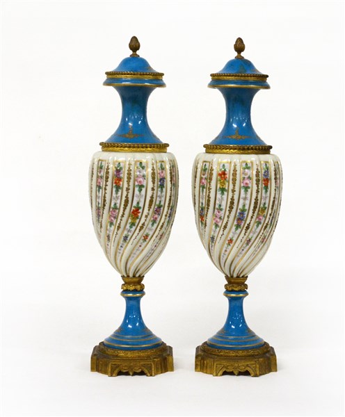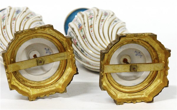 Manifattura francese, secolo XX, coppia di vasi in porcellana a fondo azzurro decorata a fiori policromi e fregi dorati, montatura in bronzo dorato e cesellato (h cm 48) (difetti, restauri e mancanze)