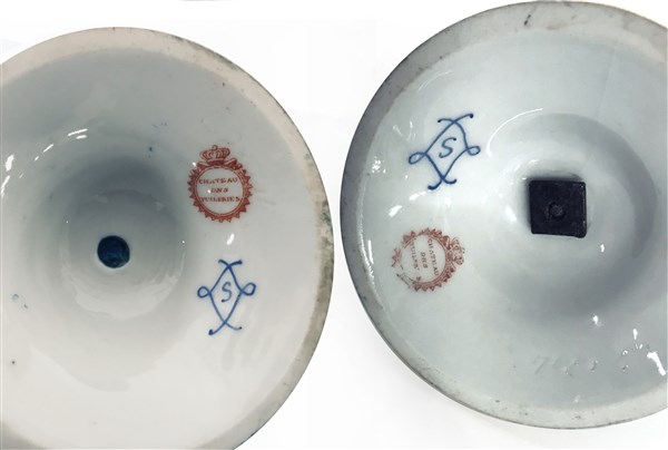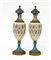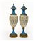 Manifattura francese, secolo XX, coppia di vasi in porcellana a fondo azzurro d