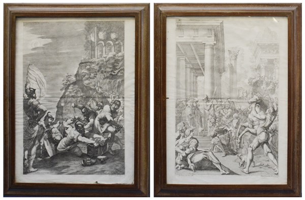 Giacomo Giovannini da Ludovico Carracci. Coppia di acqueforti del secolo XVIII raffiguranti soggetti storici (mm 550x370) In cornici (difetti)