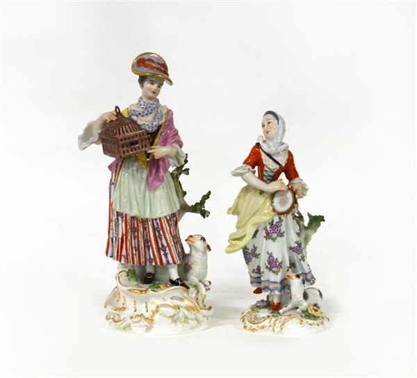 Manifattura di Meissen, secolo XX, lotto di due gruppi in porcellana policroma raffuguranti gentildonna con gabbietta (h cm 29) e suonatrice di tamburello (h cm 22) (difetti e mancanze)
