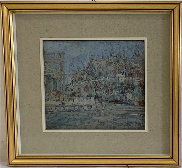 "San Marco Venezia" olio su tavola (cm 22x25) Firmato e datato 1949 in basso a destra. Al retro: firmato e titolato. In cornice