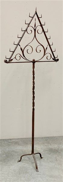 Antico candeliere in ferro battuto con fregio centrale a volute (h cm 187) (dif
