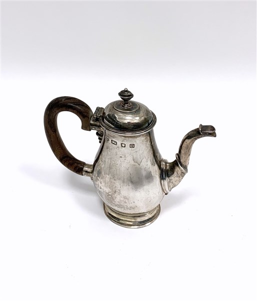 Caffettiera in argento liscio con anse in legno sagomato. Inghilterra inizio secolo XX (gr 300 lordi)