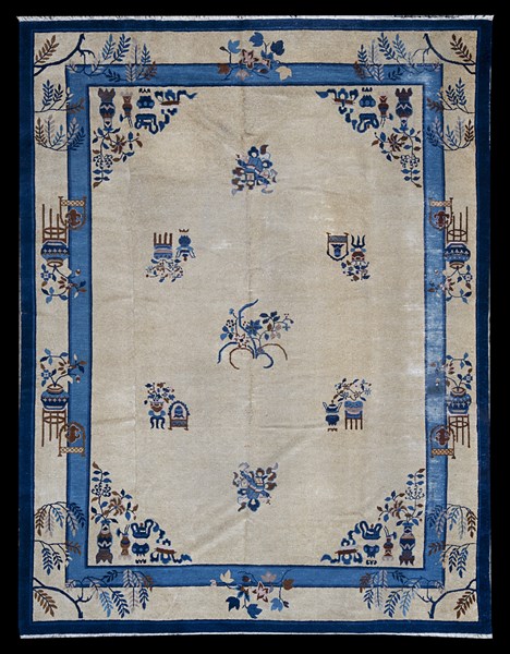 Decoro con simboli taoisti e rami fioriti sparsi su fondo crema. Bordura interna con fondo azzurro, bordura principale a fondo crema cosparsa di vasi e rami fioriti (cm 352x271) (difetti, rapature e un vecchio restauro)